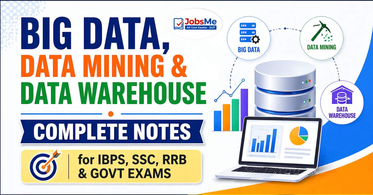 Big Data, Data Mining, and Data Warehouse is a rapidly growing topic in IBPS, SSC CGL, RRB NTPC, and all government job exams, especially for IT-related roles. This post covers everything — definition and 5Vs of Big Data, Big Data tools (Hadoop, Spark, Kafka), Data Warehouse concepts, Data Mining, all four types of data analytics, OLAP vs OLTP, ETL process, Business Intelligence, and key data concepts — with memory tricks, one-liners, and 10 exam-focused FAQs.