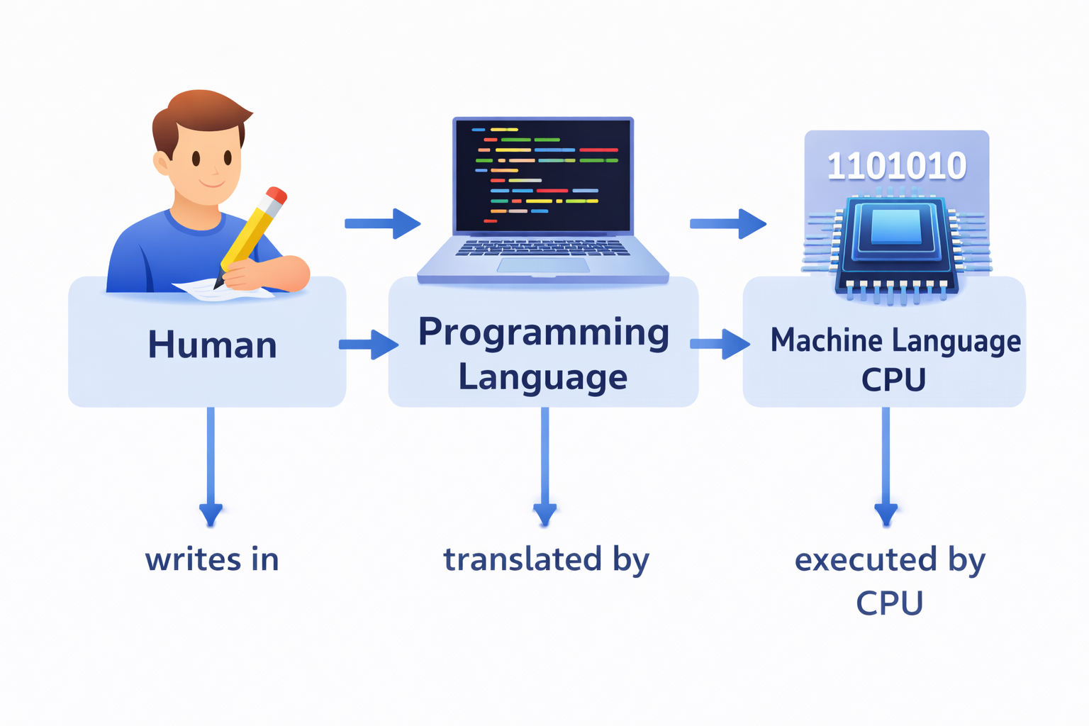 Why do we need programming languages? A computer's CPU only understands machine language (binary — 0s and 1s). Humans find it nearly impossible to write programs in binary. Programming languages provide a middle ground — they allow humans to write programs in a more understandable form, which is then translated into machine language for the computer to execute.