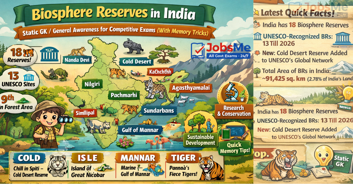 Biosphere Reserves in India are UNESCO-recognised protected areas aimed at conserving biodiversity while promoting sustainable development. This topic is highly important for SSC, UPSC Prelims, Banking, Railways, Defence, and State PCS exams due to its static nature and frequent repetition in PYQs.