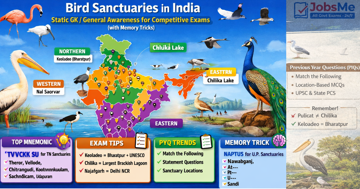 Bird Sanctuaries in India are a high-yield Static GK topic repeatedly asked in SSC, Banking, UPSC, Railways, Defence, and State PCS exams. This post gives you region-wise classification, exam tables, mnemonics, PYQ trends, and one-liners—perfect for fast revision and maximum accuracy.
