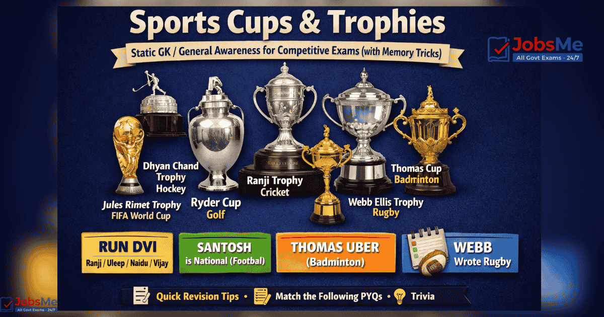 Cups and trophies associated with sports and games form a highly repetitive Static GK topic in SSC, Banking, UPSC, Railways, Defence, and State PCS exams. This post gives you exam-oriented classification, tables, mnemonics, PYQ trends, and one-liners for fast revision and long-term retention.