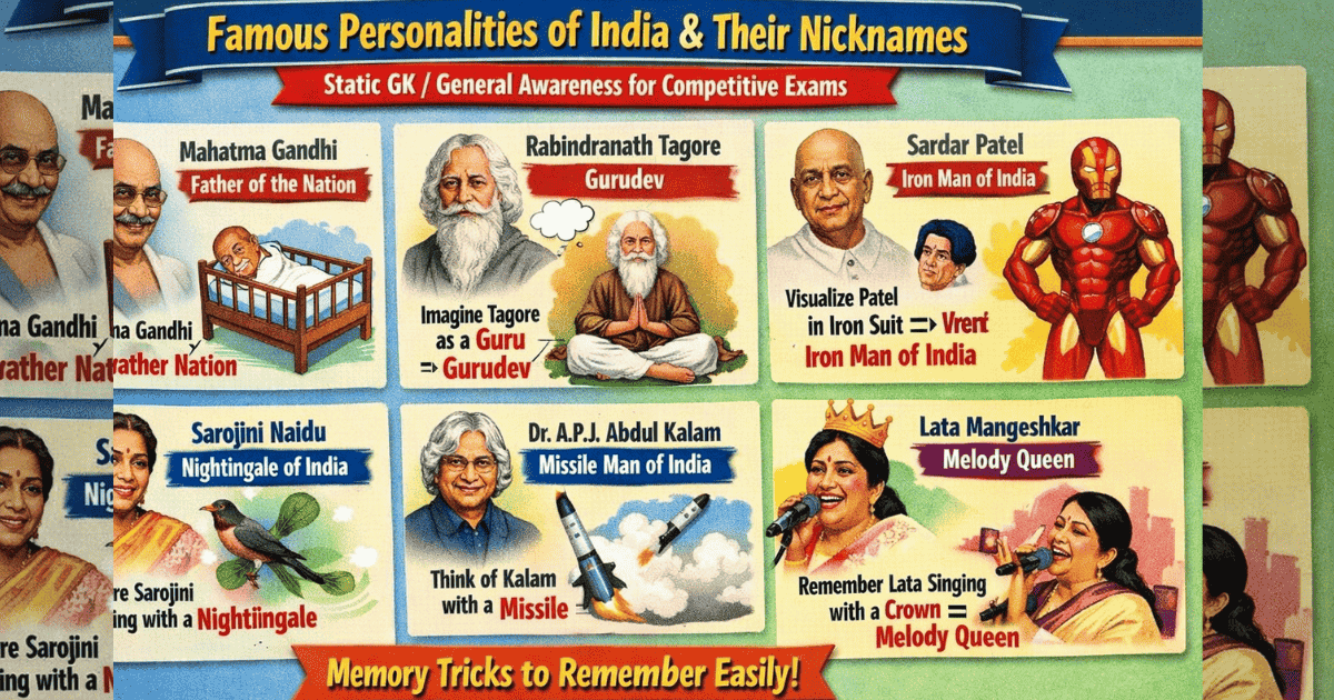 Nicknames of famous personalities are one of the most frequently asked Static GK topics in SSC, Banking, UPSC, Railways, and Defence exams. These short, fact-based questions test memory, so mastering them with mnemonics and tables can boost your score quickly.