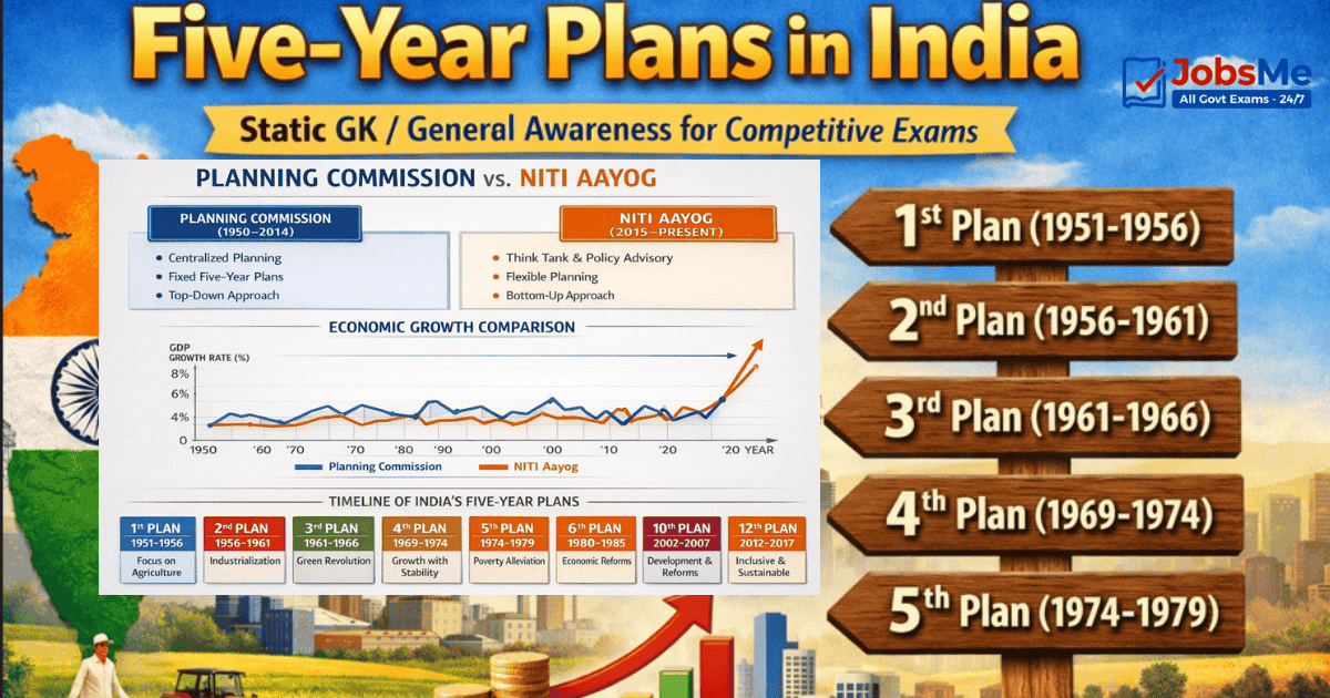 The Five-Year Plans were India’s centralized economic planning strategy from 1951 to 2017. They are extremely important for UPSC, SSC, Banking, Railways, and Defence exams because questions are frequently asked on timelines, objectives, and outcomes.
