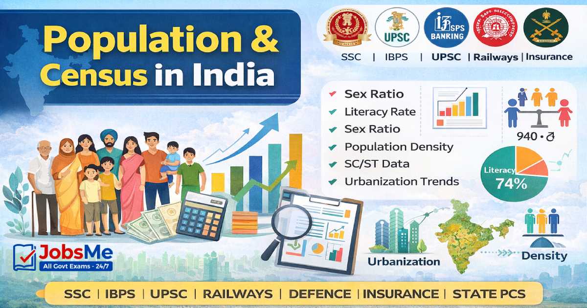 Population & Census in India is one of the most important Static GK / General Awareness topics for SSC, IBPS, UPSC Prelims, Railways, Defence, Insurance & State PCS exams. Questions are frequently asked on Census 2011, literacy rate, sex ratio, population density, decadal growth, SC/ST data, and urbanization trends.